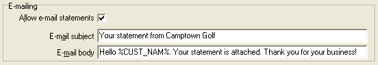 In the E-mail subject field, enter the subject you want to use by default for e-mailed A/R statements (e.g., Your statement from Camptown Golf).