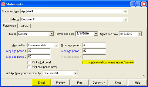 When you print or preview statements for A/R customers, you can include customers to whom you send statements via e-mail by selecting the Include e-mail customers in print/preview check box. If you do not select this check box, statements will not be printed for customers for whom the Allow e-mail statements check box is selected.