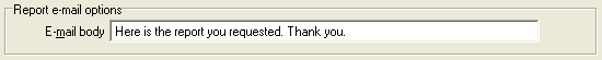 In the E-mail body field, enter the body text you want to use by default for reports sent via e-mail (e.g., Here is the report you requested. Thank you.).