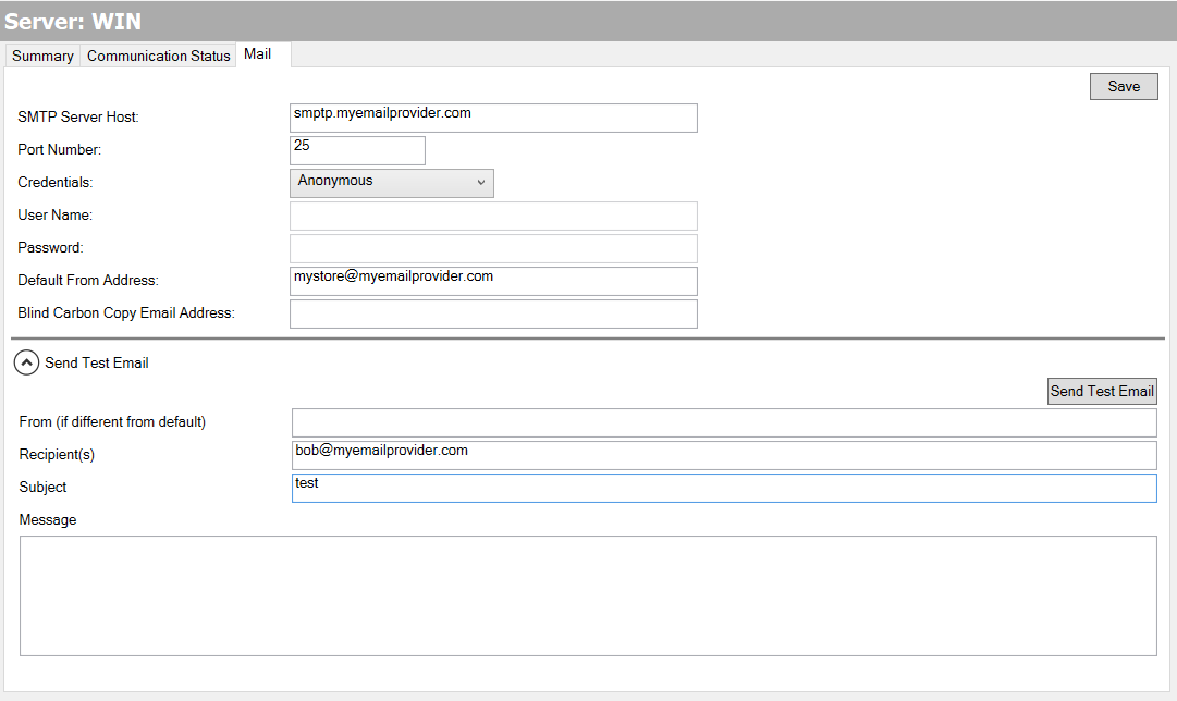 To do so, expand the Send Test Email section of the Mail tab, specify the Recipient(s) for the message (separating each address with a semicolon), enter a Subject and Message, and then click the Send Test Email button.